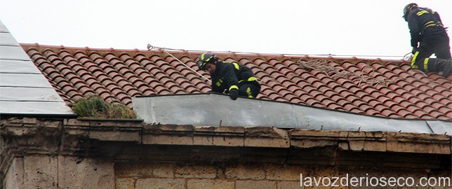 Los bomberos retiran unas cornisas en la iglesia San Pedro