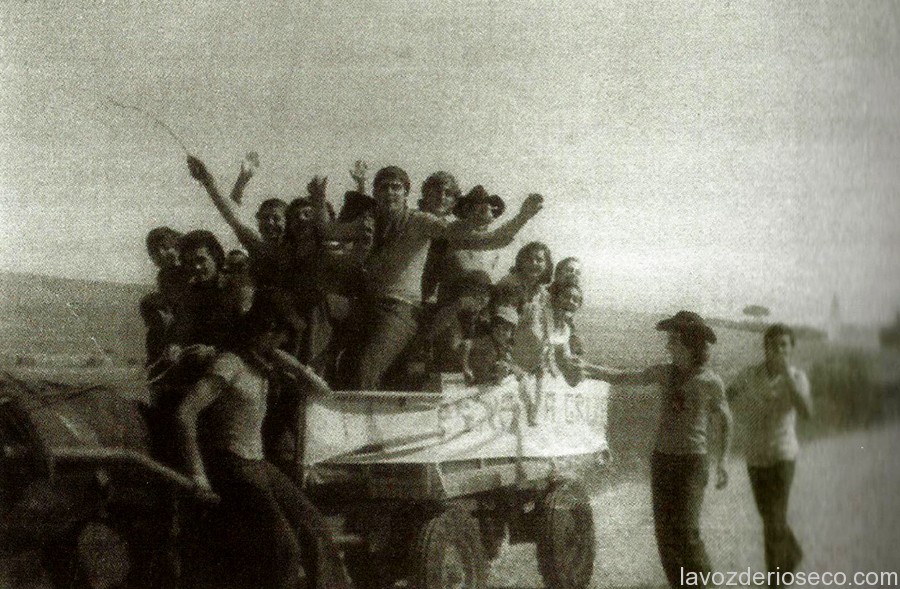 Era común en la festividad de Castilviejo, los días previos y el propio 8 de septiembre, acercarse hasta al ermita a celebrar buenas comidas y merendolas en presencia de familiares y amigos. Cualquier vehículo era bueno para este menester, como este carro -atestado de jóvenes- y tirado por una mula en el camino de Castilviejo. Diversión y gastronomía unidos en la fiesta de la patrona riosecana.