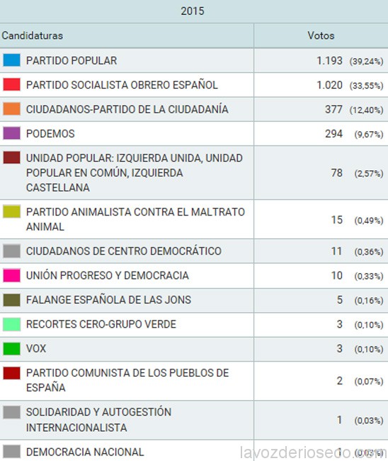 En Rioseco como es sabido, la victoria en las urnas fue para el Partido Popular con 1.193 apoyos (39,24%), seguido del Partido Socialista con 1.020 votos (33,55%). Ciudadanos se convierte en tercera fuerza política con 377 votos (12,40%) y cuartos son Podemos con 294 votos (9,67%). Unidad Popular logró 78 apoyos (2,57 por ciento) y ya de forma testimonial otros partidos obtuvieron un puñado de votos como el Partido Animalista Contra el Maltrato Animal (15), Ciudadanos de Centro Democrático (11) o Unión Progreso y Democracia (10).