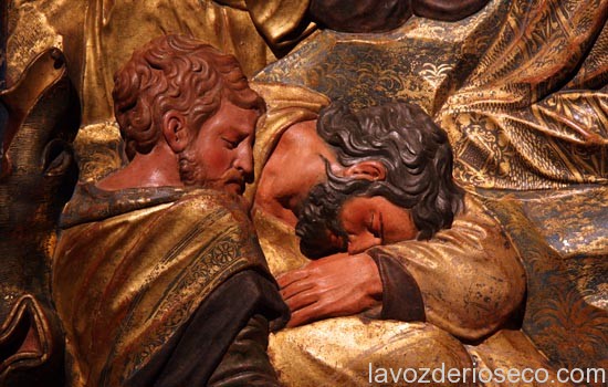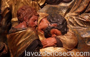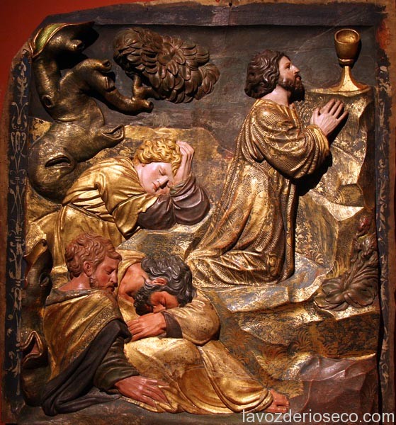 El bajorrelieve tiene una composición similar a la del mismo tema utilizado en otros retablos del maestro, como el de la iglesia de San Pedro de Cisneros, y sobre todo, el de San Ginés de Villabrágima. En un espacio comprimido sitúa a sus figuras de canon corto, formando una línea cerrada, envueltas en ropajes de finos plegados lineales. El árbol de tronco retorcido y las lajas del montículo en el que reza Jesús completan la ambientación. Los rostros son serenos, de perfil cuadrático, por lo que no hay el componente expresivo característico de Berruguete. Pero el forzamiento de las articulaciones de algunos cuerpos se relaciona directamente con el estilo juniano.