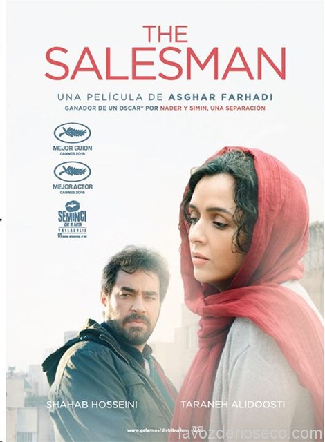 El viajante de Asghar Farhadi (El pasado, Nadar y Simin, una separación), obtuvo muy merecidamente el Oscar a la mejor película en lengua no inglesa y el Premio al mejor actor para Shahab Hosseini en el festival de Cannes. Tras El pasado, rodada en Francia, Farhadi regresa a Teherán, para contarnos una relación de pareja trastornada por un hecho fortuito: tras un traslado de piso, una mujer abre la puerta de la casa pensando que quien llama es su marido; quien ha llamado, en cambio, es un extraño que buscaba a una inquilina anterior. Mientras la mujer está en el baño, se produce una agresión sexual que no vemos, pero sospechamos.