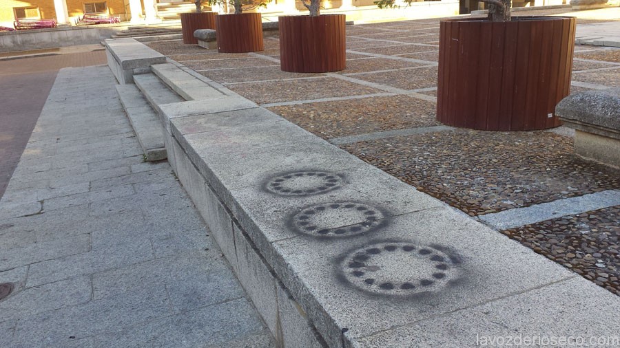 Nos envían esta fotografía de la Plaza Mayor, frente al Ayuntamiento, donde se aprecian unas pintadas en el granito de la estructura del espacio. Según nos explica este lector parece que alguien ha pintado unos tapacubos de un coche o algo similar sin tener el suficiente cuidado de poner un papel para no manchar el pavimento.
