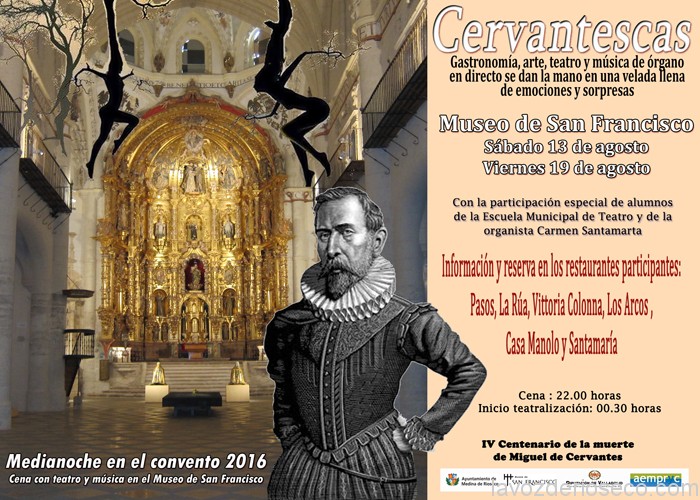 La cena en alguno de los seis restaurantes de Medina de Rioseco que colaboran en la actividad dará paso en la antigua iglesia conventual de San Francisco a la teatralización y música en directo en un ambiente de luces y sombras, en el que los alumnos de la Escuela Municipal de Teatro darán vida a Miguel de Cervantes y a algunas de sus creaciones literarias en un diálogo con músicas de la época interpretadas en un órgano positivo por Carmen Santamarta, pianista riosecana con muchos años en la interpretación y enseñanza en la música y un gran número de conciertos en su haber, así como participante de las más importantes actividades de Órgano Ibérico o Barroco realizadas en la comunidad de Castilla y León.